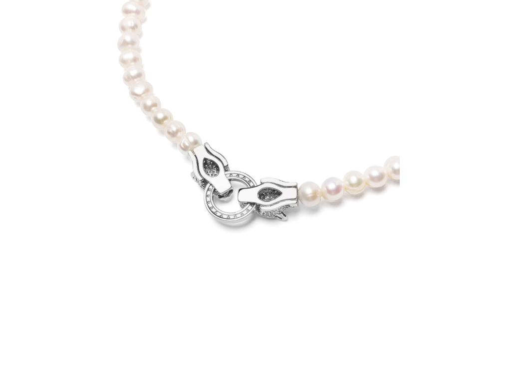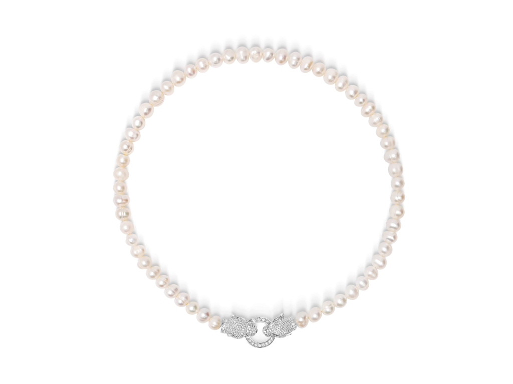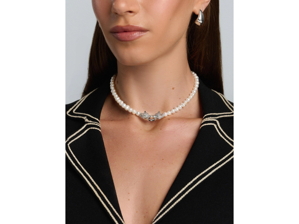Dominantním prvkem tohoto chokeru je nádherné stříbrné zapínání ve tvaru hlavy pantera, které dodává designu nádech dravé elegance. Hlava pantera je detailně propracovaná a zdobená třpytivými kameny z kubické zirkonie, čímž vytváří působivý kontrast s perlami.