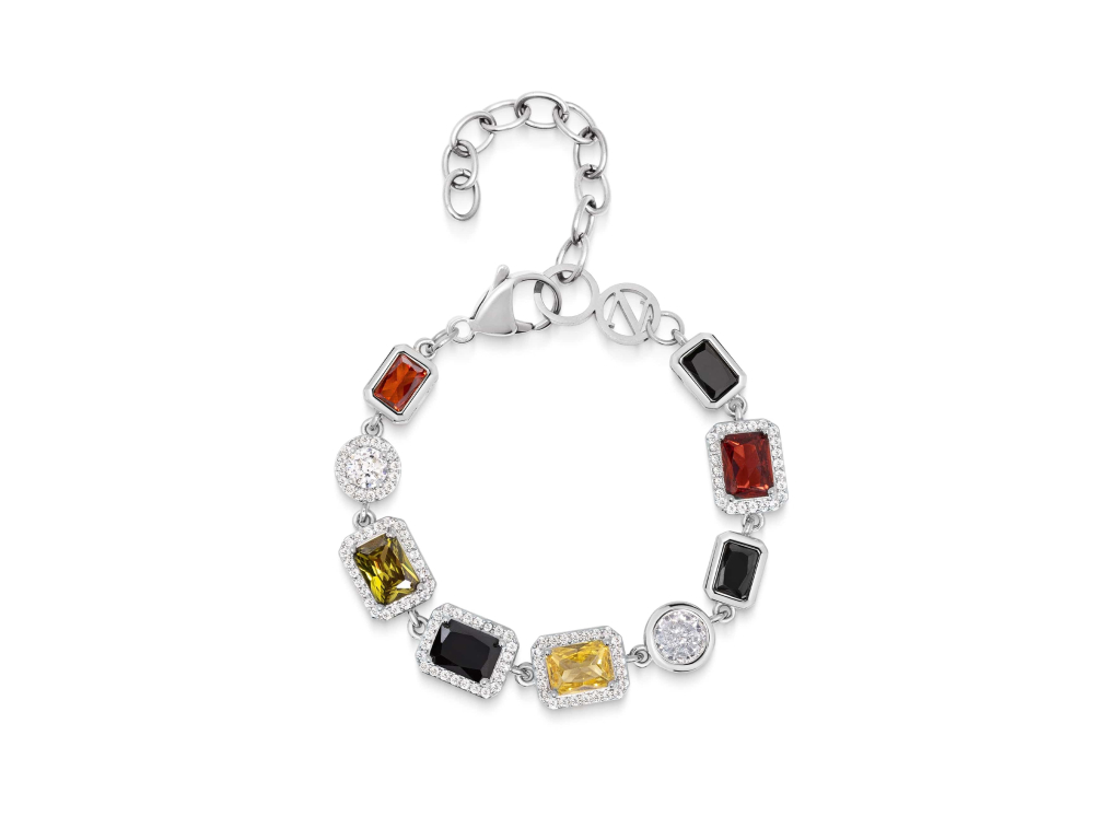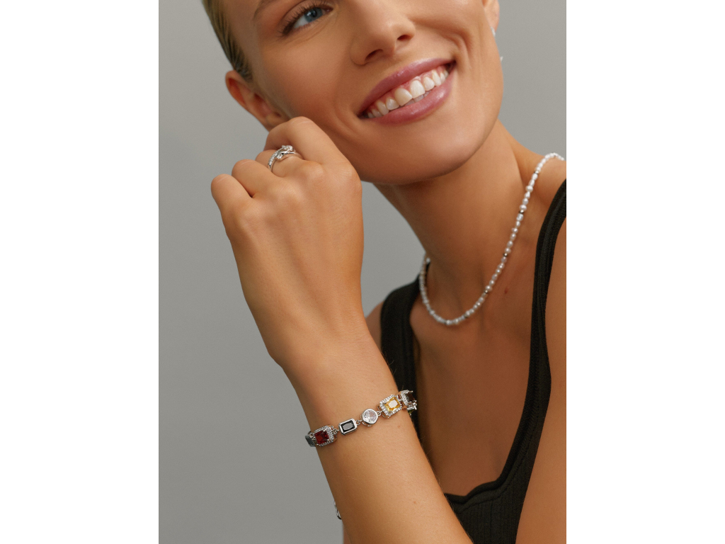 Působivá kombinace kontrastu, barev a řemeslného zpracování — navrženo pro moderní ženu. Tento zářivý náramek obsahuje precizně uspořádané ručně zasazené kameny: ovály v odstínu šampaňského, olivově zelený kouřový křišťál, tmavě červené granáty a zlatavě žlutý citrín v elegantních obdélníkových brusech. Každý drahokam — rubín, peridot, černý onyx — je mistrovsky zasazen v pevných obrubách nebo klasických čtyřramenných úchytcích, doplněných jiskřivými kameny kubické zirkonie nejvyšší kvality (AA).