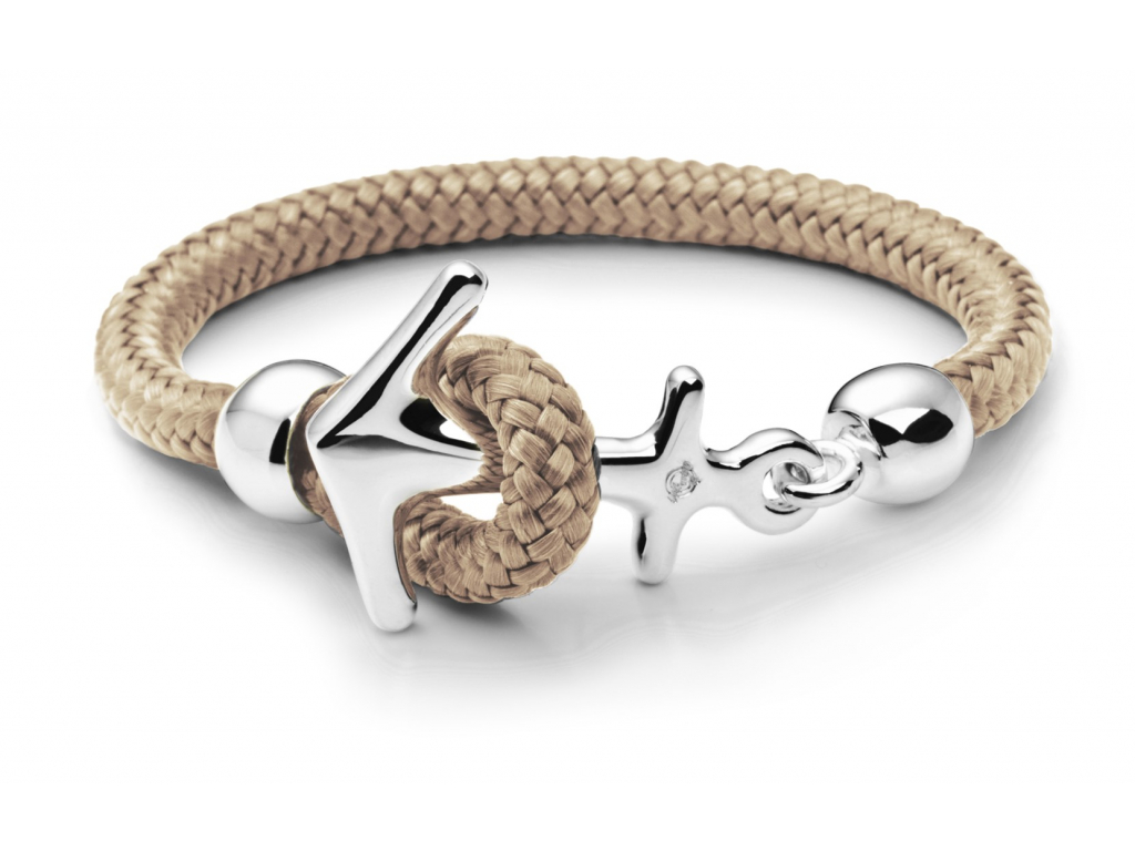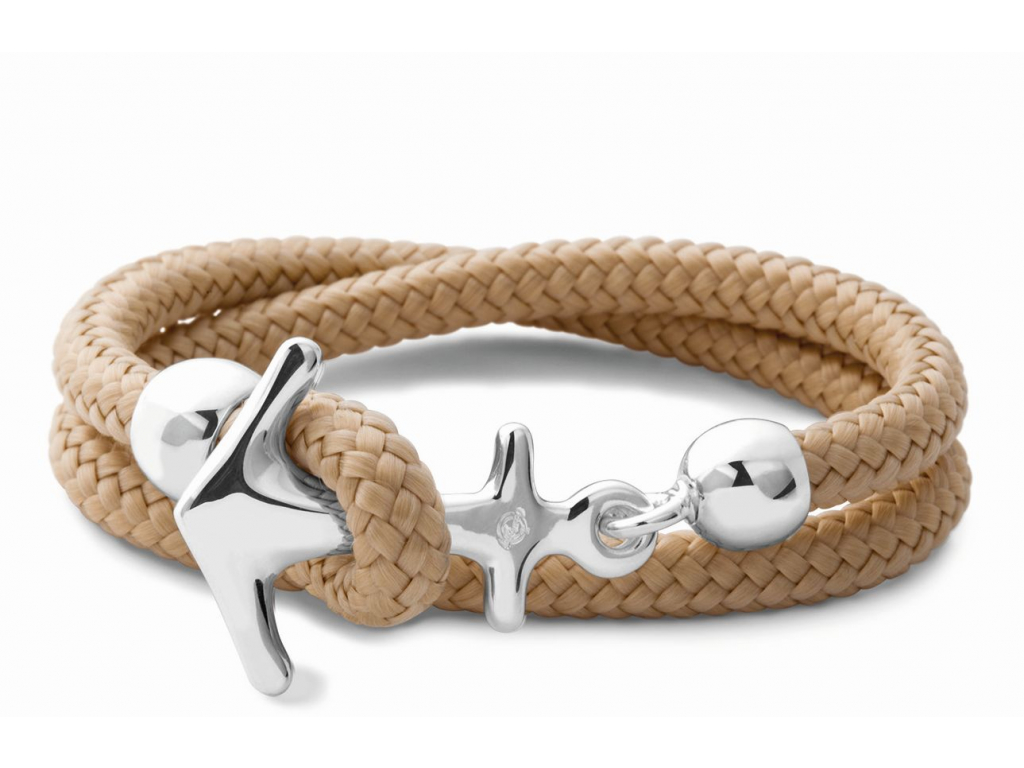 Německá značka OCEAN STORY vytvořila kolekci luxusních jachtařských šperků, které se vyznačují exkluzivitou a jedinečným zpracováním. Tento náramek je navržen v barvě Sand Beige, je velmi přírodní a připomíná odlehlé písečné pobřeží v Karibiku. Tato barva je perfektní kombinací pro všechny odstíny podzimu a zimy, ale díky delikátnímu zpracování je vhodné do každého období. Speciálně vázané námořnické lano je obmotáno kolem zápěstí a uchyceno kotvou o velikosti 29mm, která  působí jako spona. Masivní kotva je vyrobena ze sterlingového stříbra 925/1000. Speciální námořnické lanko je měnitelné a je možné jej zaměnit za další lákavé barvy z palety Ocean Story. Tento exkluzivní šperk je možné nosit též jako náhrdelník.