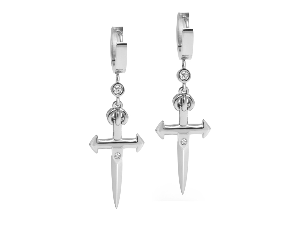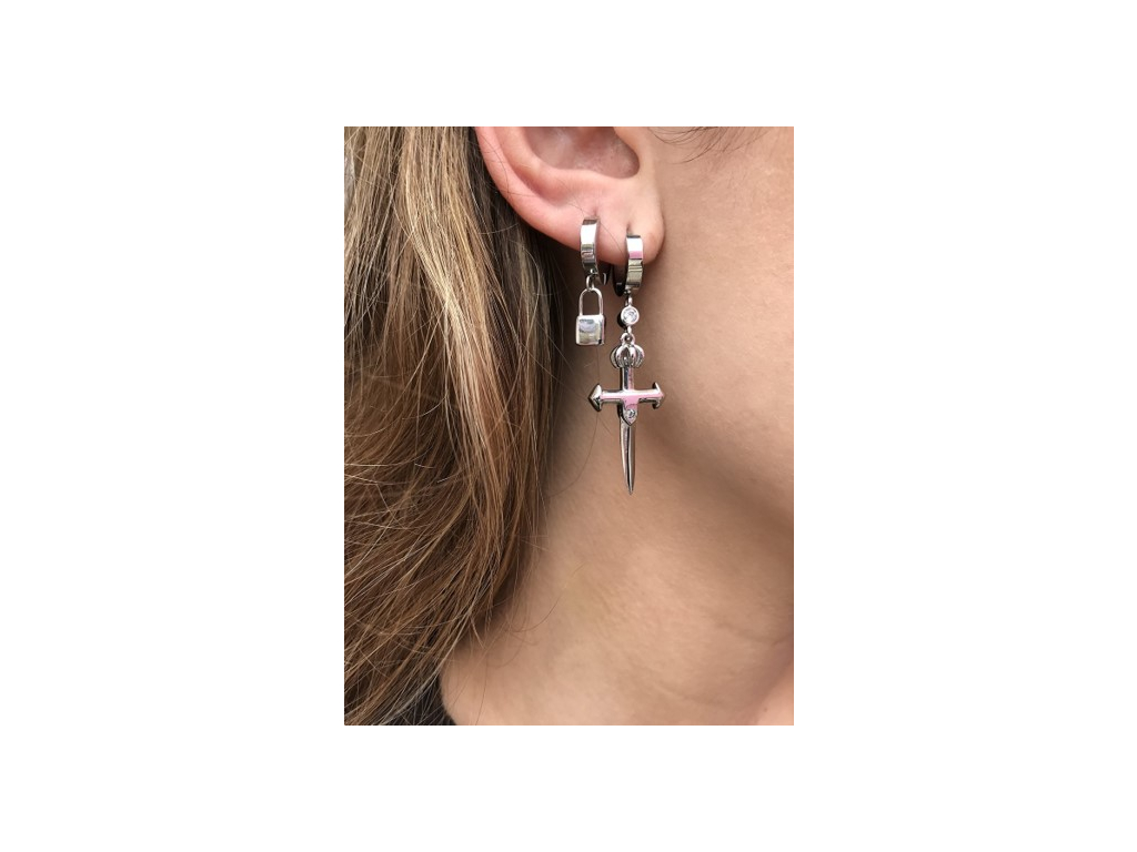 Exkluzivní dámské náušnice ve tvaru meče jsou vyrobené z vysoce kvalitní švédské ušlechtilé oceli, která je velmi odolná oděrům. Symboly meče jsou ozdobené čirými kameny s briliantovým výbrusem a jsou zavěšené na masivních kroužcích. Kroužky se zavírají "zacvaknutím".