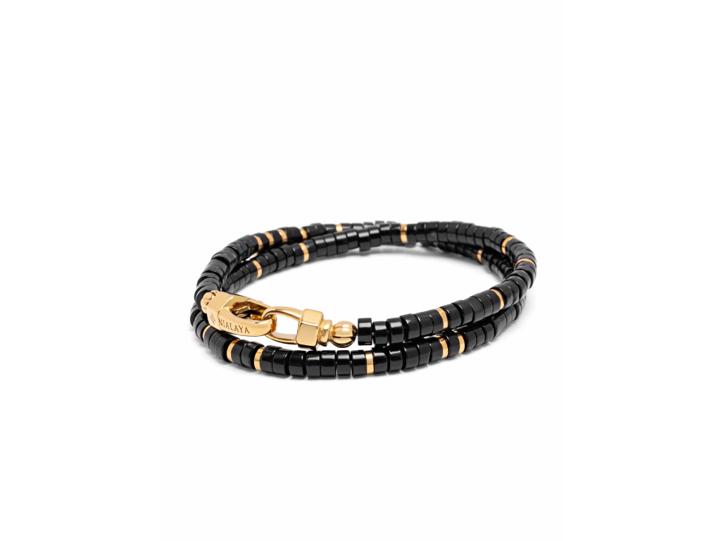 Minimalistický, odvážný a navržený tak, aby podtrhl váš styl. Černé korálky Heishi se setkávají s leštěným 18k zlatem v dvojitém náramku, který působí moderně, vyváženě a vždy dokonale.