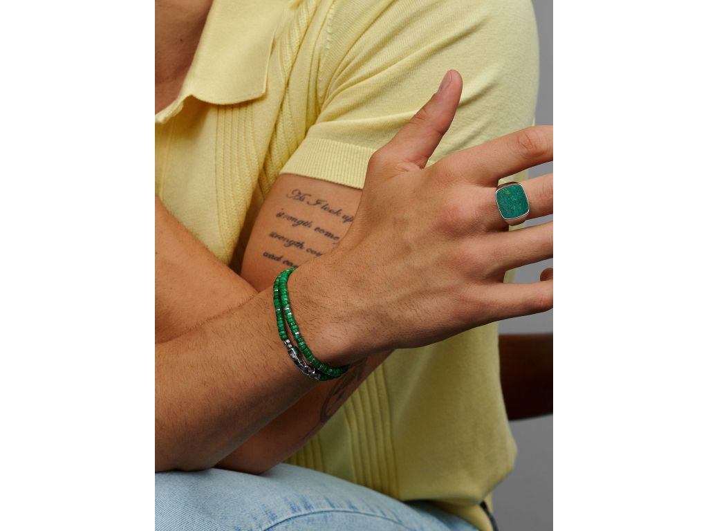 Živé zelené Heishi korálky se snoubí s leštěnou vysoce kvalitní švédskou nerezovou ocelí v tomto dvojitě omotávaném náramku — čistý, svěží a navržený pro každodenní styl.