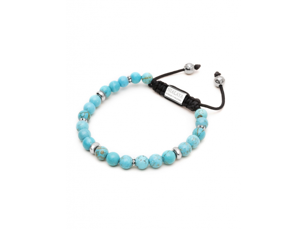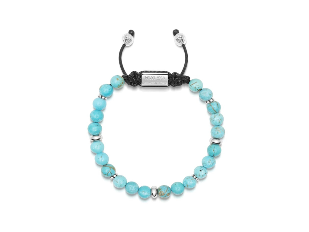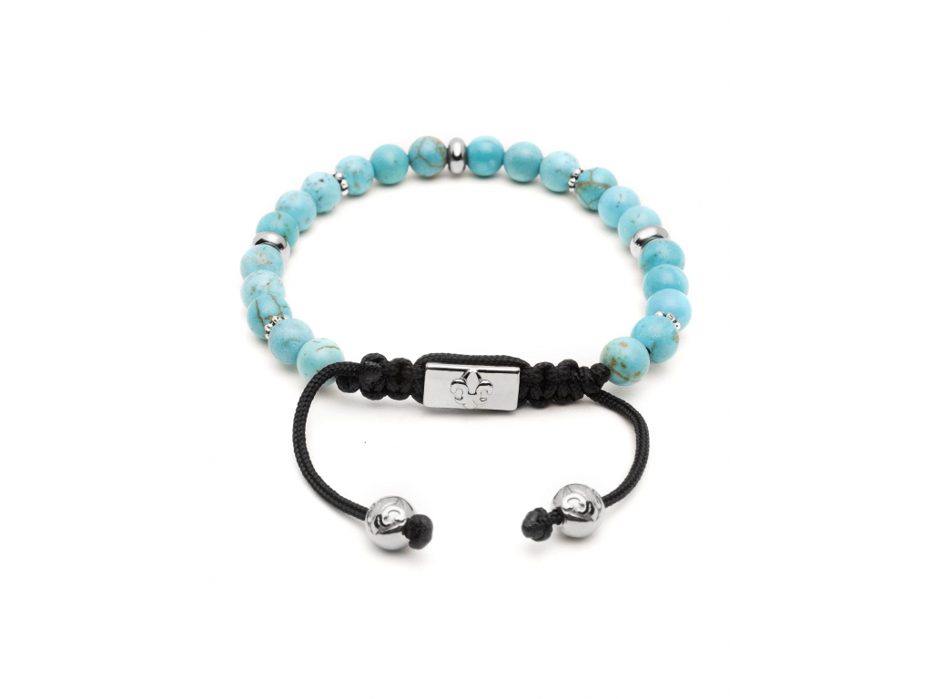 Dokonalá a stylová kombinace nádherného tyrkysu a vysoce kvalitní ušlechtilé oceli u tohoto ručně vyrobeného náramku Nialaya přináší skutečný skvost do vaší šperkovnice. Drahokamy jsou pečlivě navázány na pevné a kvalitní nylonové vlákno a zakončené ikonickým stahovacím zámkem, který nese identické rytiny Nialaya - rok výroby šperku, ikonickou lilii a podpis designera Jannika Olandera. Šperk nese ikonické logo značky v podobě úchvatné Fleur - de - lis (lilie). Díky ikonickému stahovacímu zakončení má šperk velmi univerzální velikost - je možné jej korigovat utahováním.