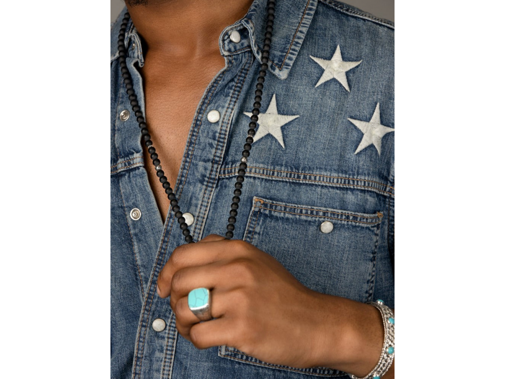 Luxusní pánský šperk z exkluzivní kolekce pánských náhrdelníků. Skládá se z broušených kamenů (onyx) a je doplněn kuličkami z vysoce kvalitní ušlechtilé oceli a ručně vyrytými ochrannými symboly NIALAYA. Decentní šperk obsahuje extrémně pevné a odolné vlákno.