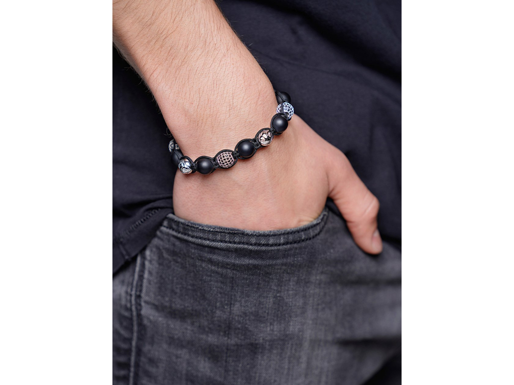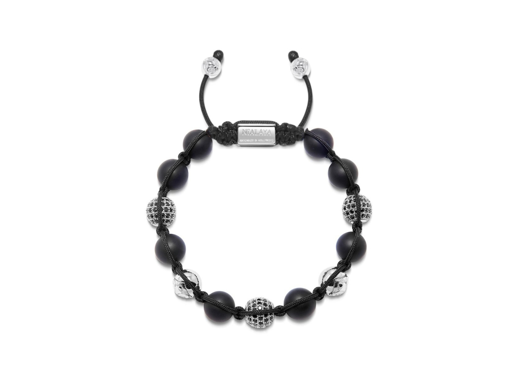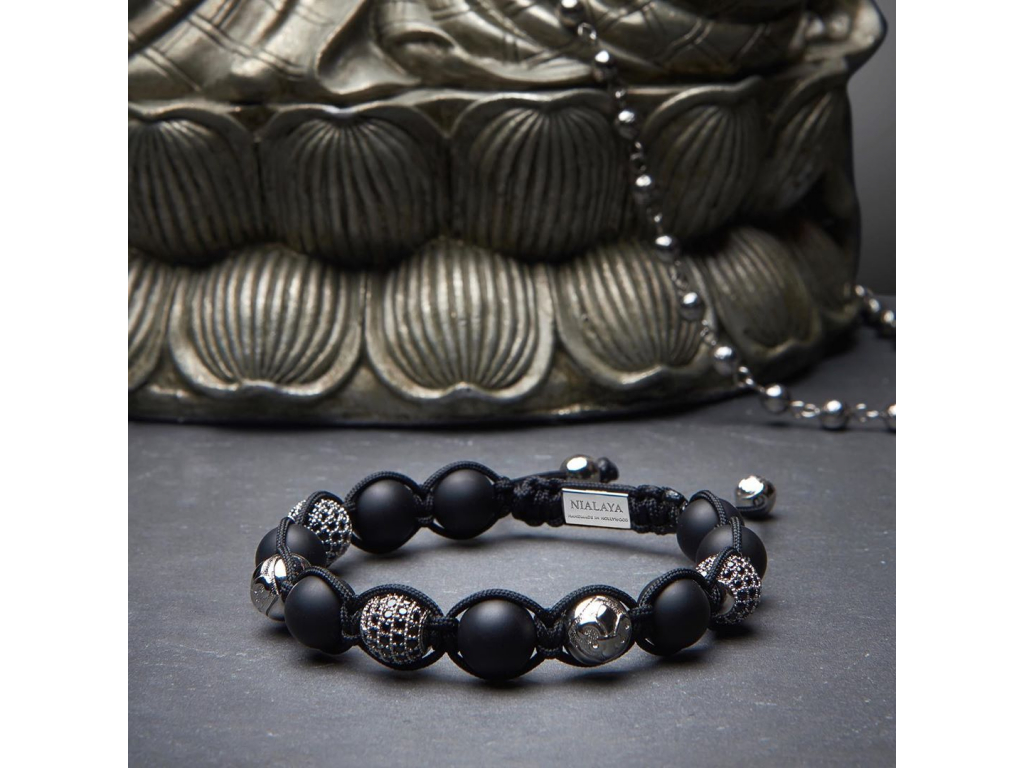 Dokonalá a stylová kombinace matného onyxu a sterlingového stříbra ručně vyrobeného náramku Nialaya přináší skutečný skvost do vaší šperkovnice. Drahokamy jsou pečlivě navázány na pevné a kvalitní nylonové vlákno a zakončené ikonickým stahovacím zámkem, který nese identické rytiny Nialaya - rok výroby šperku, ikonickou lilii a podpis designera Jannika Olandera. 10mm broušené kameny onyxu jsou doplněny sterlingovým stříbrem o ryzosti 925/1000  a doplněny černými CZ diamanty - kameny s briliantovým výbrusem. Šperk nese ikonické logo značky v podobě úchvatné Fleur - de - lis (lilie). Díky ikonickému stahovacímu zakončení má šperk velmi univerzální velikost - je možné jej korigovat utahováním.