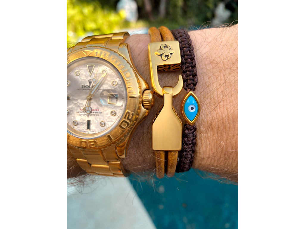 Minimalistický stahovací náramek ze speciálního, velmi pevného nylonového vlákna je zakončen ikonickým stahovacím zámkem Nialaya s uvedením roku výroby této kolekce a podpisem designéra Jannika Olandera. Symbolu evil eye z tyrkysového enamelu a vysoce kvalitní ušlechtilé oceli pozlacené 18K zlatem přináší ochranu před pomluvami jeho nositele. Náramek je doplněn ikonickým  symbolem Fleur-de-lis.