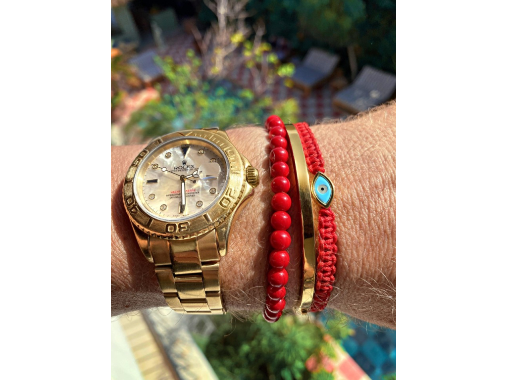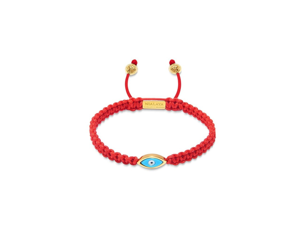 Tento náramek je ručně navlečen v losangeleském studiu na červenou šňůrku - barvu, která podle pověry posiluje vášeň, energii, sílu a lásku nositele - a zakončen pozlaceným přívěskem zlého oka (evil eye), který chrání před zlou energií. Udělejte si z tohoto šperku svůj každodenní doplněk. Jednoduchý stahovací náramek kombinuje kvalitní nylonové vlákno a vysoce kvalitní ušlechtilou ocel, pozlacenou 18K zlatem. Náramek je doplněn ikonickým symbolem lilie, která je symbolem čistoty a vznešenosti. Tento náramek je ideální pro kombinaci s dalšími náramky Nialaya.