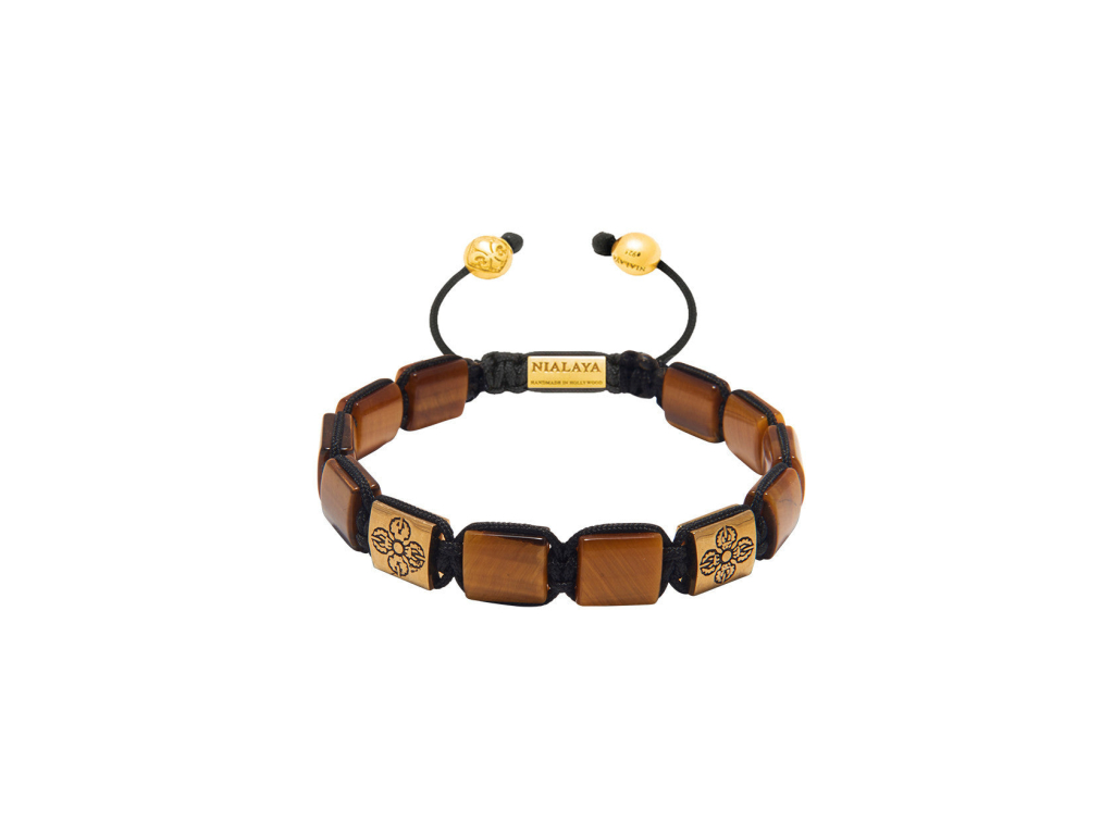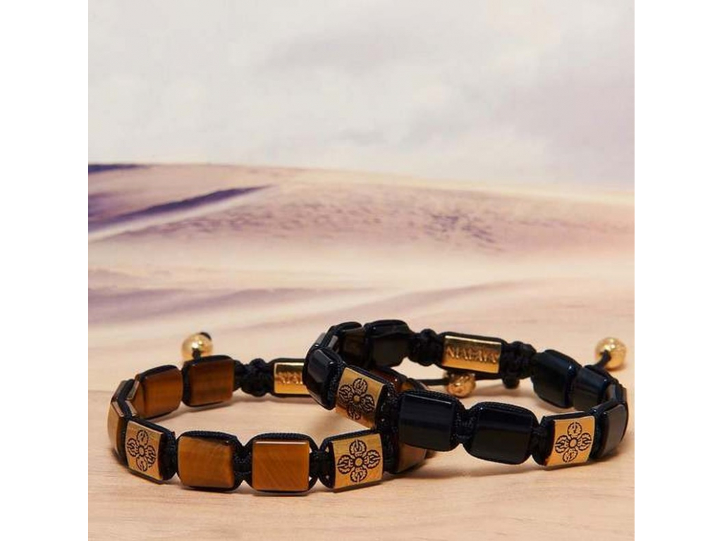 Manažerský náramek Nialaya je ručně vyroben z plochých broušených polodrahokamů. Design tohoto šperku kombinuje luxusní zpracování, léčivou energii a mocné ochranné symboly "Dorje". Náramek je vyrobený z vysoce kvalitní švédské ušlechtilé oceli, pozlacen je 18K zlatem. Ikonický stahovací zámek nese znak Fleur de lis (královská lilie) a vyrytý unikátní rok výroby této kolekce. Významný symbol Dorje posiluje tok pozitivní energie a je nástrojem velké moci. Tento náramek navíc obsahuje drahokamy tygřího oka, které jsou léčivým kamenem a podporují uklidnění těla i ducha svého nositele. Pevné nylonové vlákno je potaženo speciální vrstvou proti znehodnocení či sešoupání.