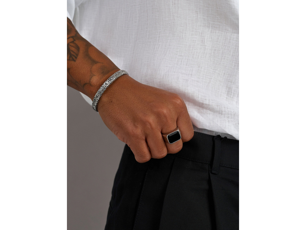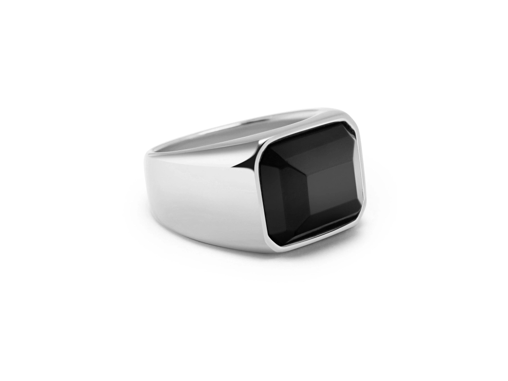 Odvážná reinterpretace klasického pečetního prstenu. Černý zirkon dodává elegantní, tajemnou hloubku, kterou doplňuje hladký povrch pro vzhled, jenž je zároveň výrazný i sofistikovaný. Nadměrný kámen propůjčuje prstenu sebevědomou přítomnost, zatímco čisté, minimalistické linie zachovávají moderní a univerzální charakter.