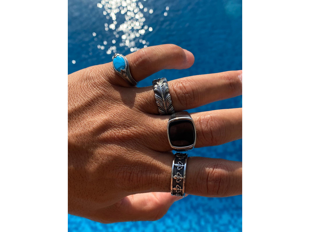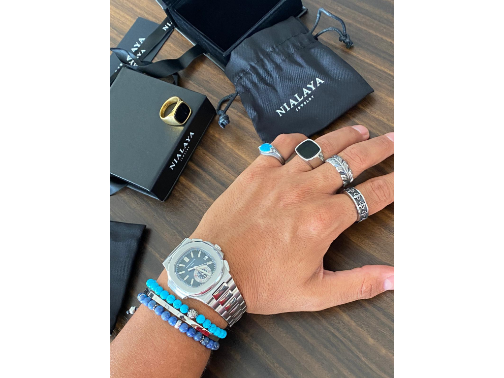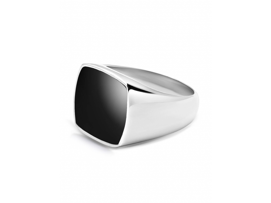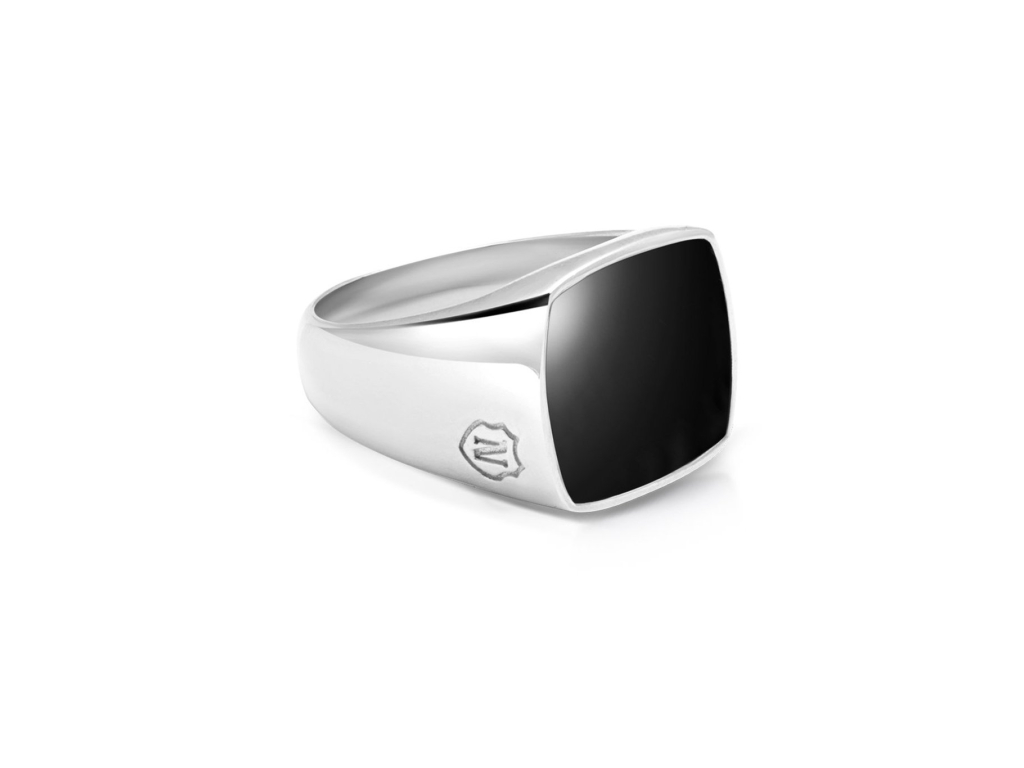 Exkluzivní kolekce masivních pánských prstenů nabízí několik modelů ručně zpracovaných prstenů. Tento stříbrný model je vyrobený z vysoce kvalitní švédské oceli a dozdobený lesklým černým onyxem. Bok prstenu zdobí písmeno N, jako označení značky Nialaya.