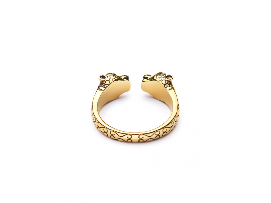 Luxusní pánský prsten se dvěma rytými na sebe pohlížejícími hlavami pantera je vytvořený z kvalitní, velmi odolné chirurgické oceli a pozlacený 18K zlatem. Nádherné detaily na dvou hlavách činí tento šperk naprosto neodolatelným.