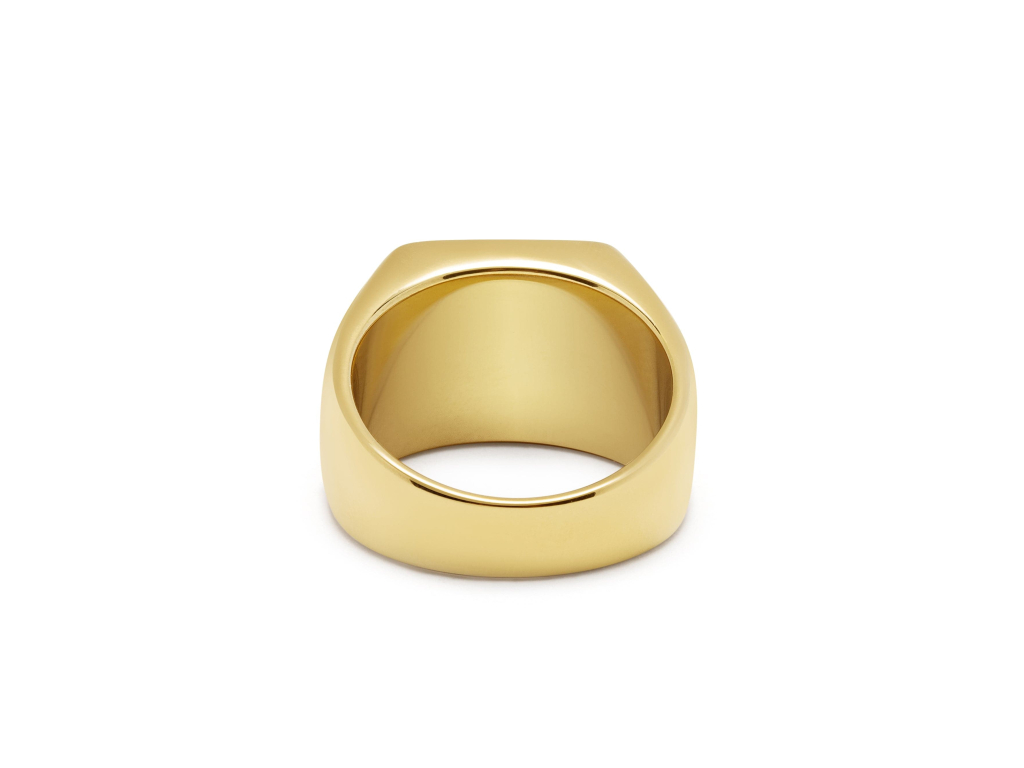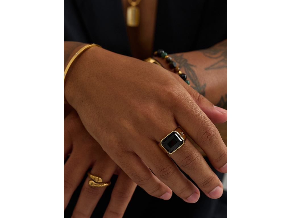 Odvážná reinterpretace klasického pečetního prstenu. Černý zirkon dodává elegantní, tajemnou hloubku, kterou doplňuje hladký zlatý povrch pro vzhled, jenž je zároveň výrazný i sofistikovaný. Nadměrný kámen propůjčuje prstenu sebevědomou přítomnost, zatímco čisté, minimalistické linie zachovávají moderní a univerzální charakter.