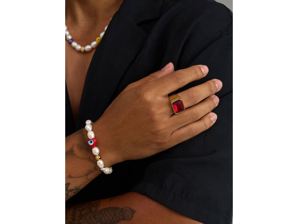 Odvážné pojetí klasického pečetního prstenu. Sytě červený zirkon zachycuje světlo výrazným, sklovitým leskem a je zasazen do hladkého zlatého povrchu, který působí zároveň silně i sofistikovaně. Dominantní kámen dodává šperku sebevědomý výraz, zatímco čisté linie zachovávají moderní a snadno nositelný vzhled.