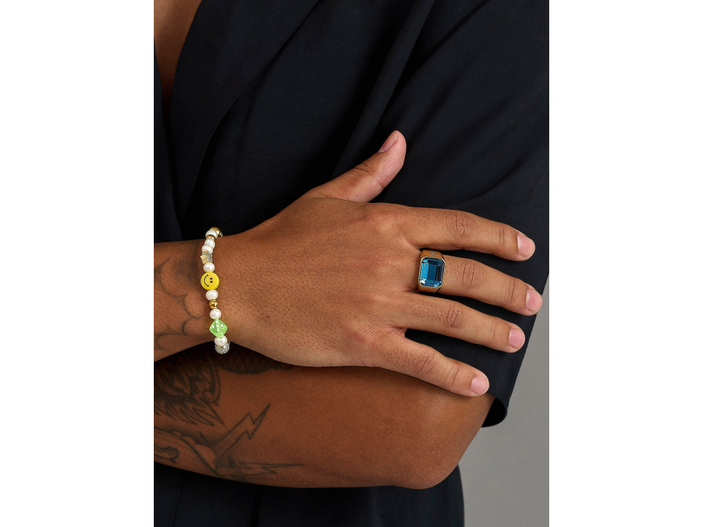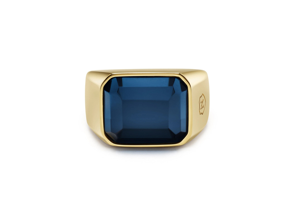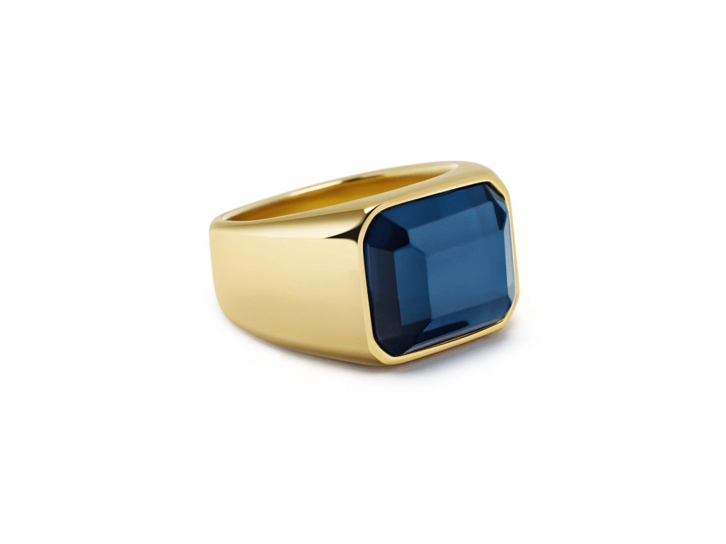 Odvážná reinterpretace klasického pečetního prstenu. Modrý zirkon dodává živou, podmanivou hloubku, kterou doplňuje hladký zlatý povrch pro vzhled, jenž je zároveň výrazný i sofistikovaný. Dominantní kámen propůjčuje prstenu sebevědomou dominanci, zatímco čisté, minimalistické linie zachovávají moderní a univerzální charakter.