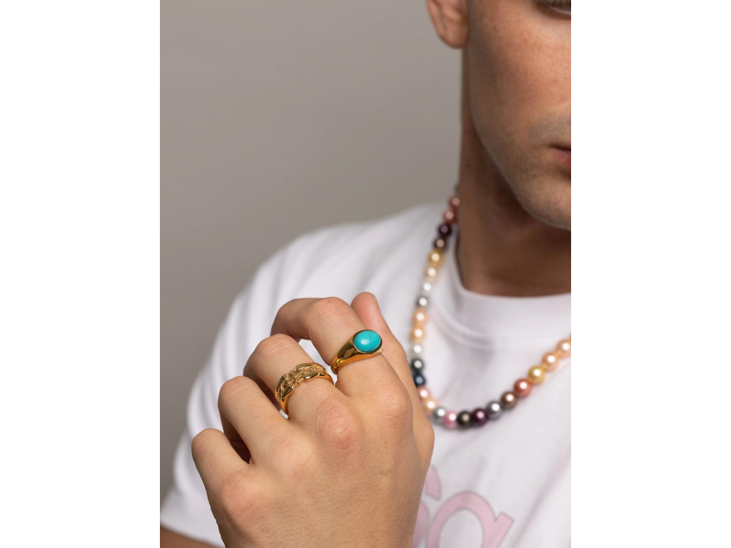 Zlatý oválný pečetní prsten s tyrkysem je luxusním spojením elegance a sofistikovanosti. Leštěný tyrkys zasazený do vytříbeného zlatého tónu vyzařuje nadčasový styl a jemnou noblesu. Ať už jej nosíte při výjimečných příležitostech nebo jako každodenní doplněk, tento prsten rozhodně upoutá pozornost a může se stát cenným šperkem, který přetrvá generace.