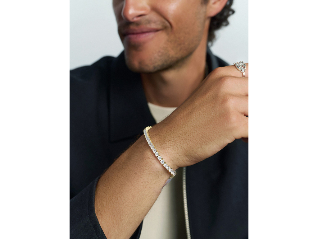 Luxusní pánský tenisový náramek je vysoce moderní záležitostí mezi pánskými šperky. Je složen z vysoce kvalitní ušlechtilé švédské oceli a pozlacen 18k zlatem, osazen je cz diamanty - kameny s briliantovým výbrusem. Opatřen je kvalitním zapínáním a logem značky Nialaya.
