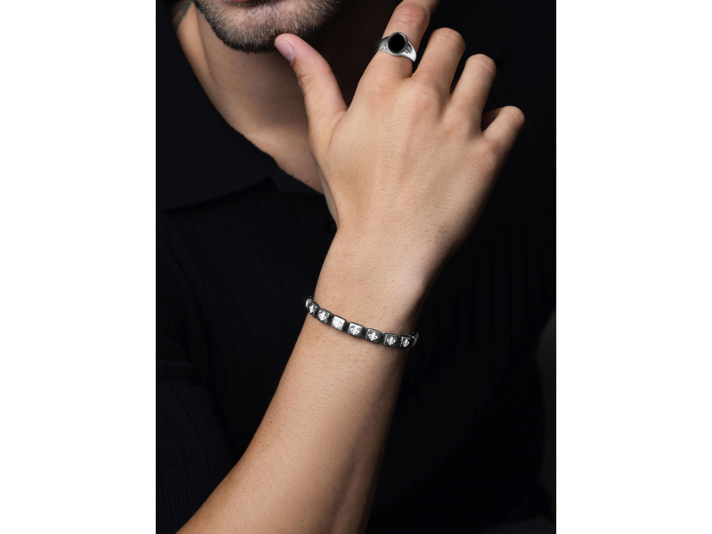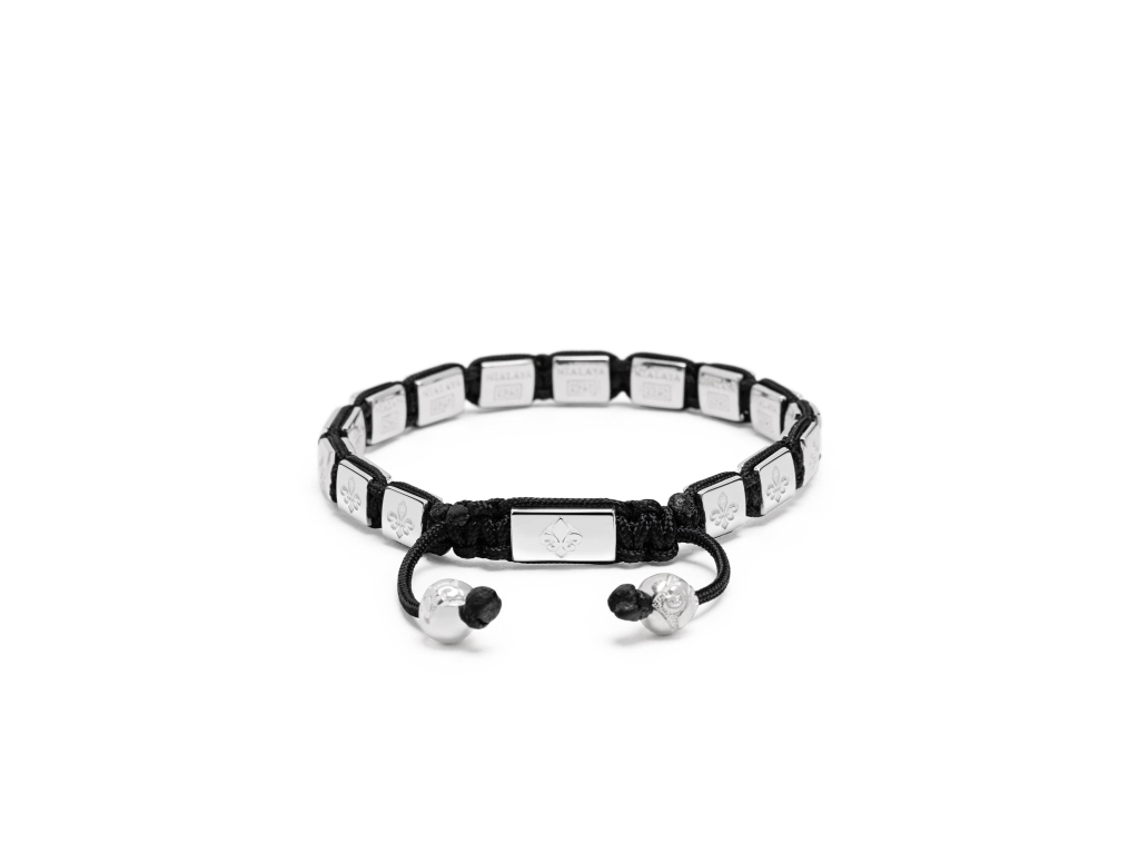 Elegantní náramek Nialaya složený z populárních mini flatbeads, které krásně padnou na vaše zápěstí. Každý flatbead vyznačuje symbolFleur-de-lis, což je symbol vznešenosti a čistoty. Náramek je vyroben ze stříbra o ryzosti 925/1000 a navlečen na pevném nylonovém vlákně. Nadčasový design plochých destiček vytváří jedinečný šperk, jehož unikátnost je podtržena rytinou roku výroby tohoto šperku a podpisem značky Nialaya. Tento šperk je vyroben pouze v limitovaném množství pro celý svět.