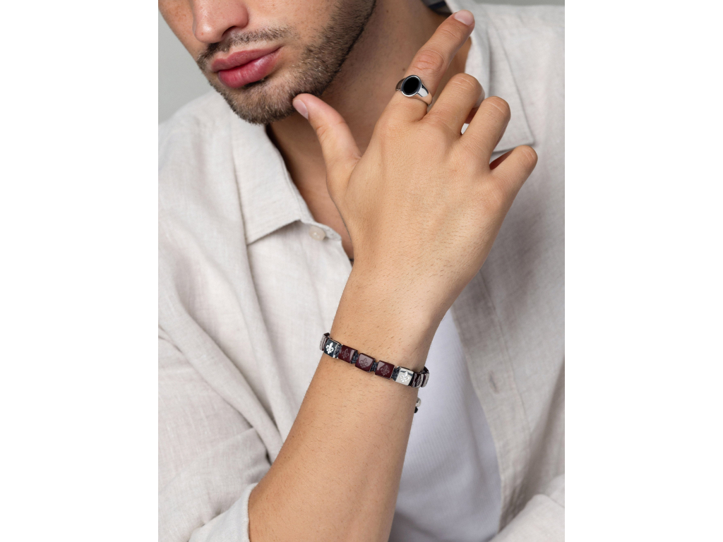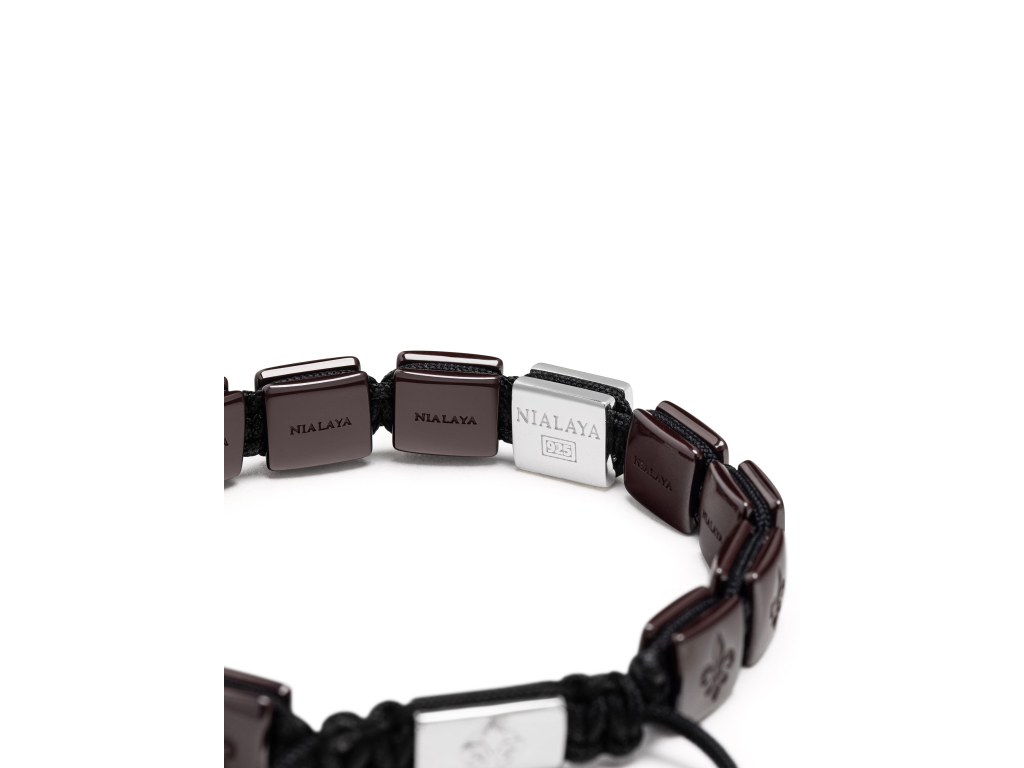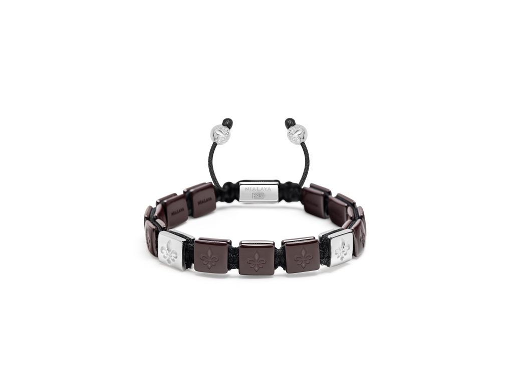 Elegantní náramek Nialaya složený z populárních flatbeads, které krásně padnou na vaše zápěstí. Každý flatbead vyznačuje symbol Fleur-de-lis, což je symbol vznešenosti a čistoty. Náramek je vyroben z ručně vyrobených tmavě červených keramických korálků a stříbra o ryzosti 925/1000, které mu dodávají eleganci. Nadčasový design plochých destiček vytváří jedinečný šperk, jehož unikátnost je podtržena rytinou roku výroby tohoto šperku a podpisem značky Nialaya. Tento šperk je vyroben pouze v limitovaném množství pro celý svět.